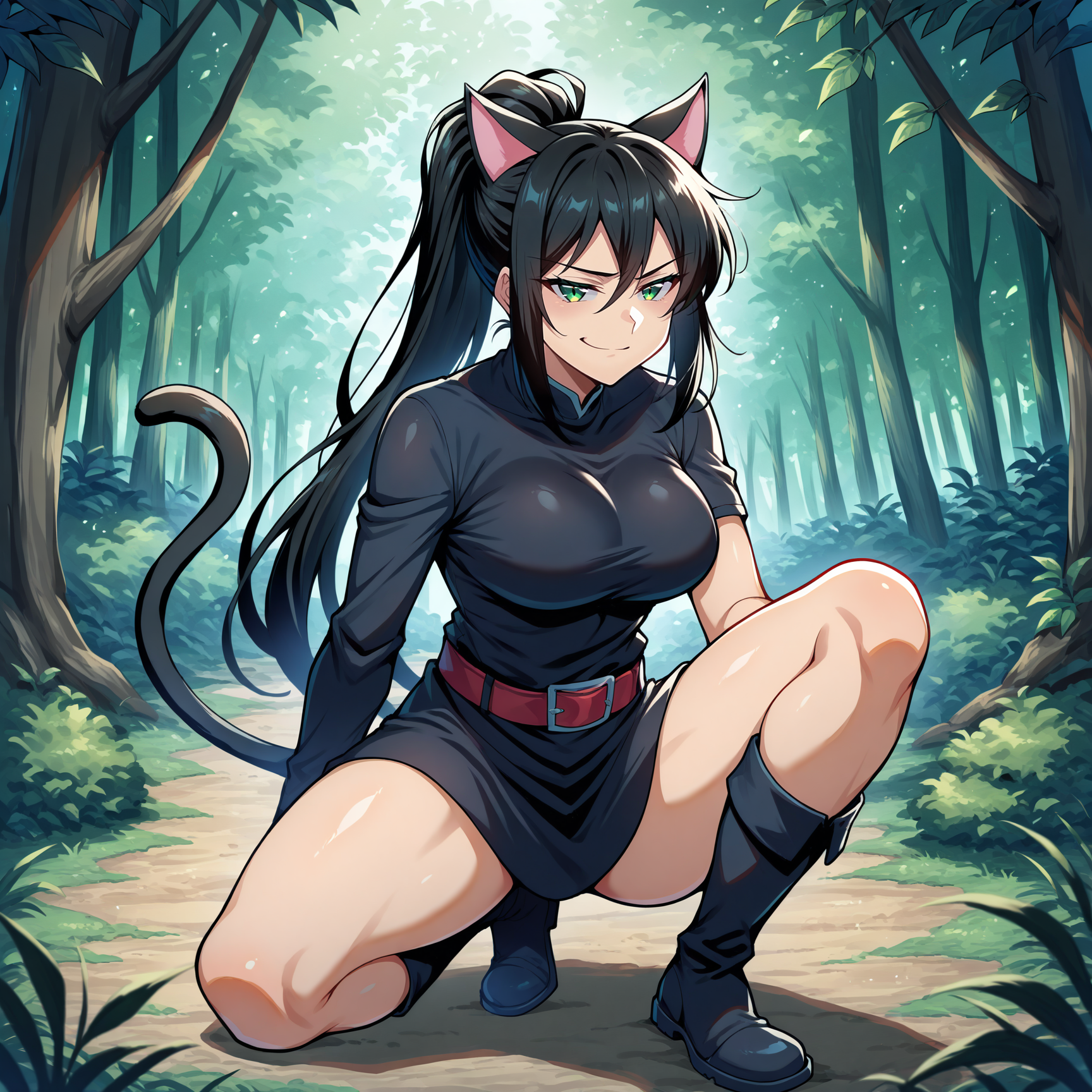 Physical Prompts 1girl, solo, black hair, hair between eyes, sidelocks, long ponytail, cat girl, cat ears, cat tail, green eyes