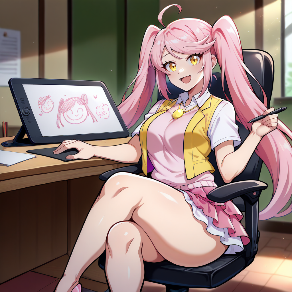 Physical Prompts 1girl, solo, pink hair, ahoge, twintails, long hair, sidelocks, swept bangs, yellow eyes