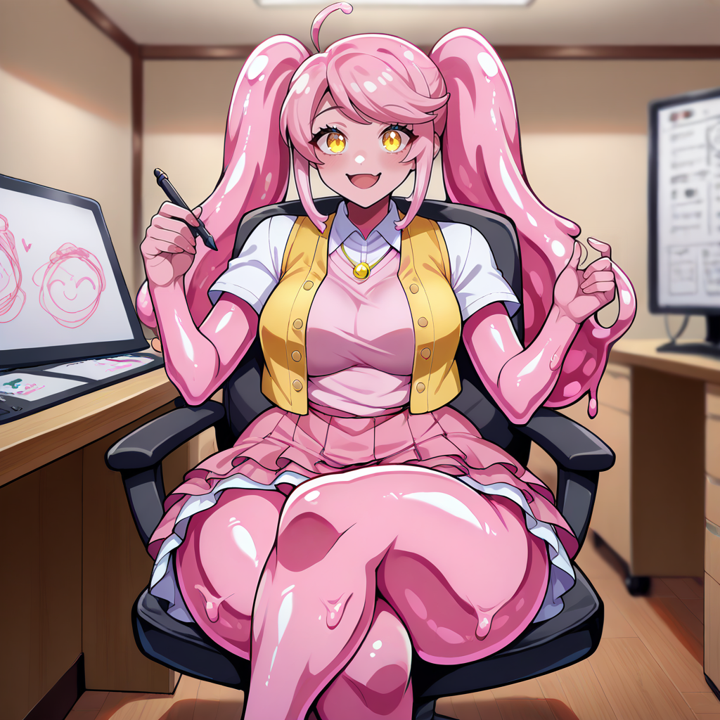 Physical Prompts 1girl, solo, pink hair, ahoge, twintails, long hair, sidelocks, swept bangs, yellow eyes, <lora:SlimeGirlsUnhingedPDXL:1>, (pink skin:1.5), slime \(substance\), slime girl