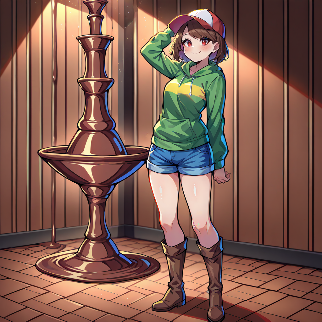 Outfit Prompts red cap, baseball cap, green hoodie, yellow stripe, single stripe, horizontal-striped hoodie, blue shorts, denim shorts, brown boots, knee boots