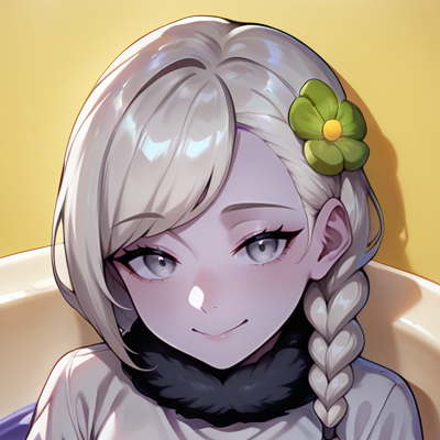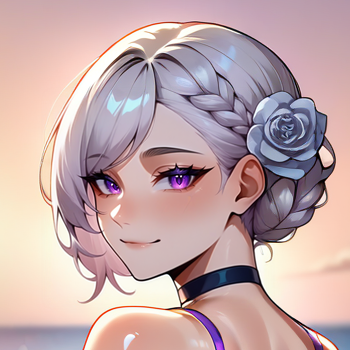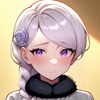 Physical Prompts 1girl, solo, light grey hair, very short hair, tied hair, swept bangs, blunt bangs, single braid, braid, grey eyes, (purple skin:1.3), slime girl, slime (substance), <lora:SlimeGirlsUnhingedPDXL:1>