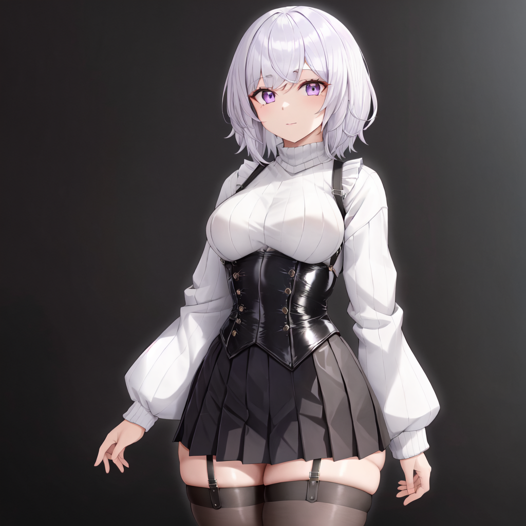 white sweater, long sleeves, wide sleeves, sleeves past wrists, black corset, black skirt, pleated skirt, suspender skirt, black thighhighs, black boots