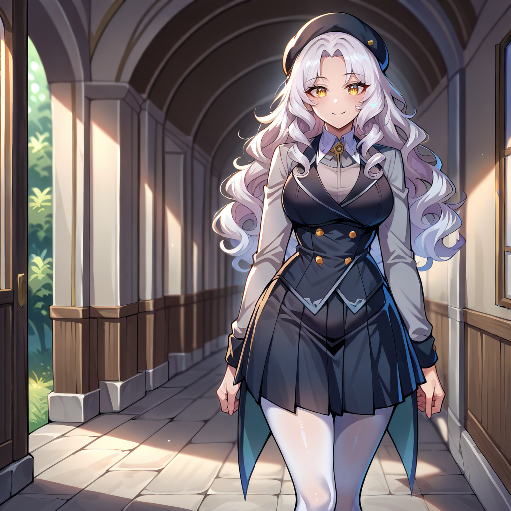 Outfit Prompts black beret, school uniform, black vest, grey stole, grey sleeves, black wrist bands, black skirt, pleated skirt, tailcoat, white pantyhose, opaque pantyhose, black shoes