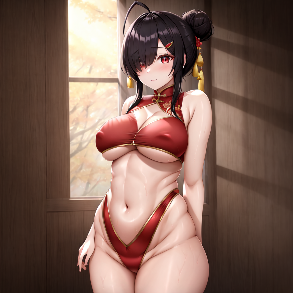 1girl, solo, black hair, single hair bun, parted bangs, swept bangs, bangs, hair over one eye, antenna hair, red eyes, long legs