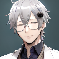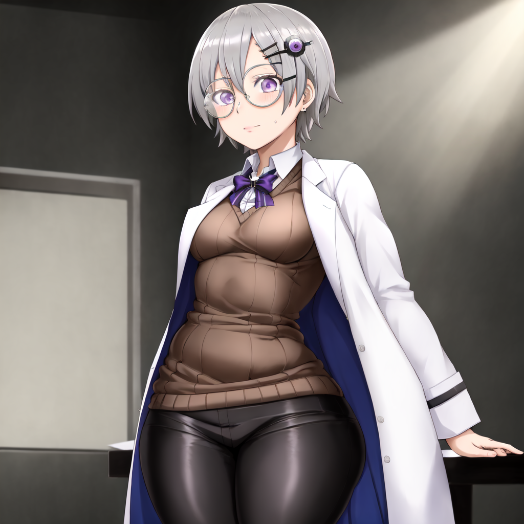 glasses, round eyewear, screw, screw in head, screw hair ornament, brown sweater, collared sweater, white coat, mad scientist, black pants, light grey shoes, seamed coat, seamed sweater, seamed body, seamed face, hidden eyes, opaque glasses