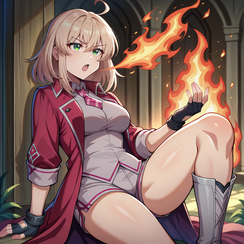 Outfit Prompts grey shirt, red coat, long coat, long sleeves, sleeves rolled up, black gloves, fingerless gloves, magical girl, grey shorts, grey boots, knee boots