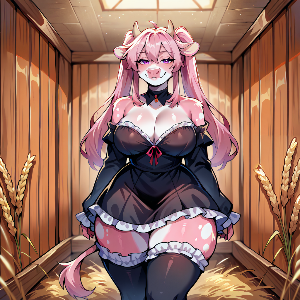 1girl, solo, source furry, pink hair, long hair, twintails, tied hair, hair between eyes, sidelocks, pink eyes, vampire, hucow, furry, transformation, animalization, <lora:ToraFurry_XL_PonyV6_Pear_p1-t1:1>, white spots, pink fur, furry female, anthro, ushimimi, cow limbs, cow muzzle, (cow, hooves, udder:1.2), cow girl, cow horns, cow tail