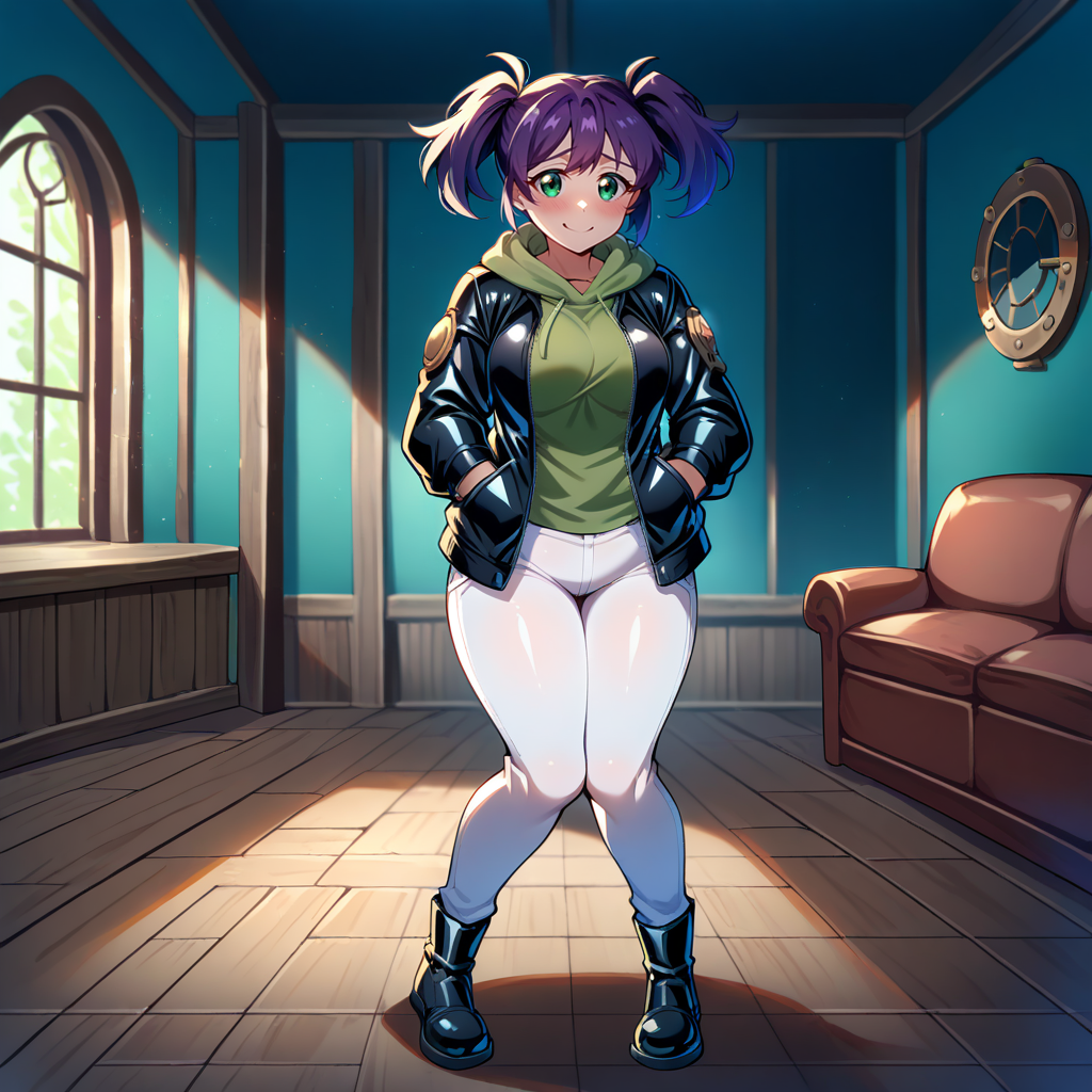 Outfit Prompts green shirt, black jacket, latex jacket, open jacket, hood, hood down, white pants, black boots
