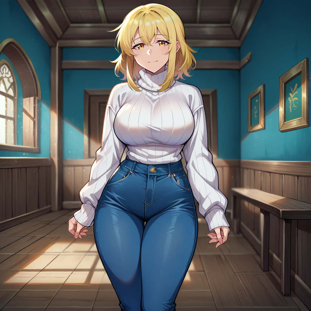 Outfit Prompts white sweater, long sleeves, sleeves past wrists, turtleneck sweater, blue jeans, brown shoes