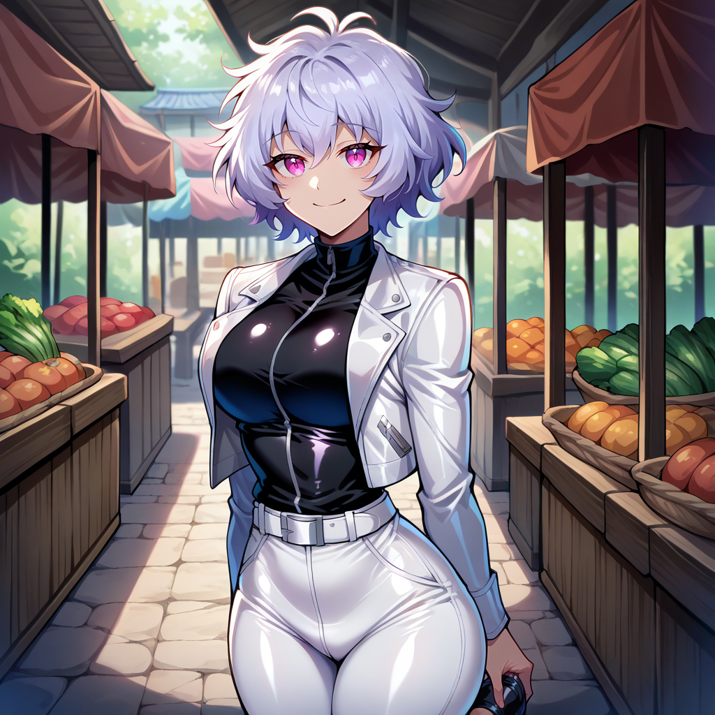 Outfit Prompts black shirt, white belt, multiple belts, white jacket, latex jacket, open jacket, white pants, black shoes