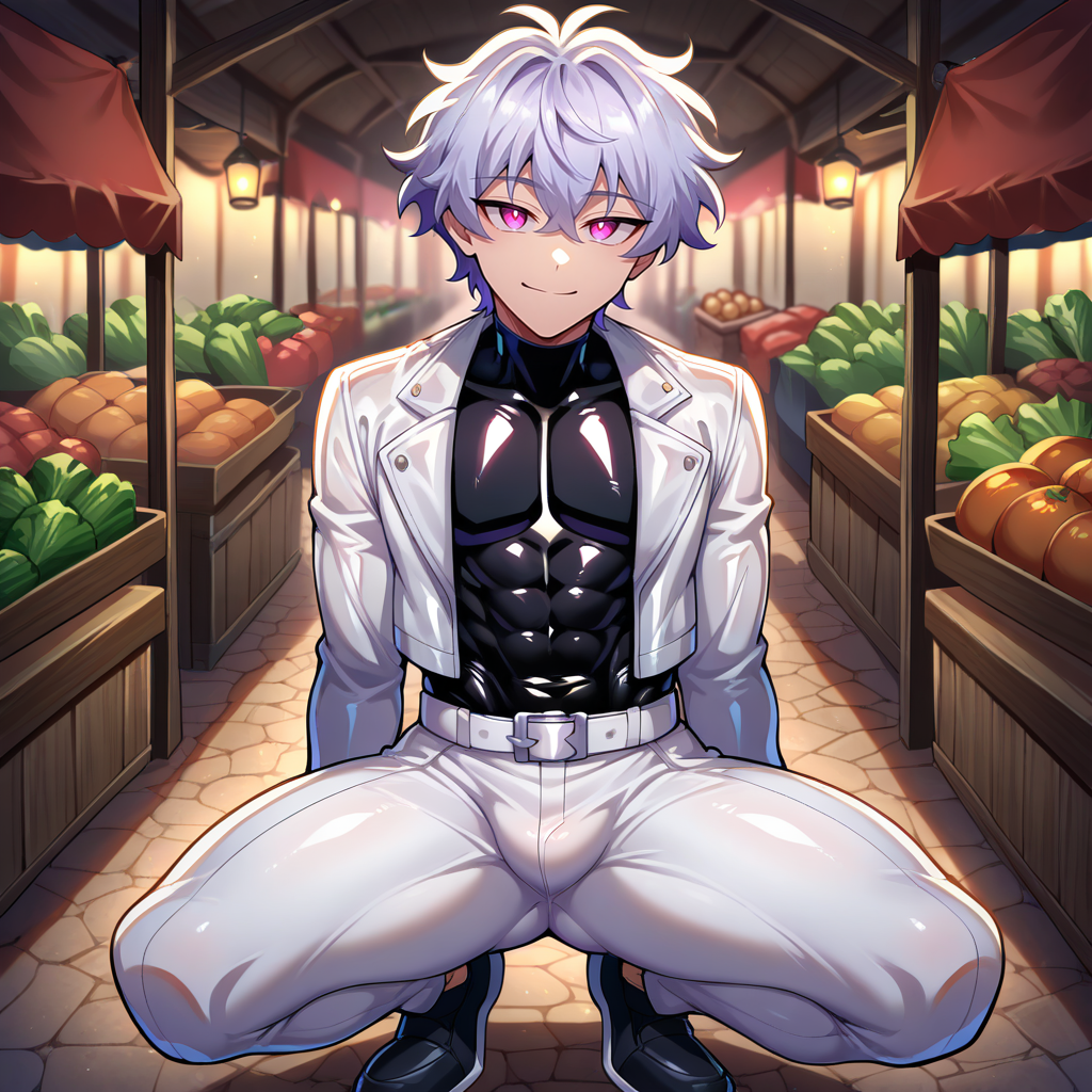 Outfit Prompts black shirt, white belt, multiple belts, white jacket, latex jacket, open jacket, white pants, black shoes