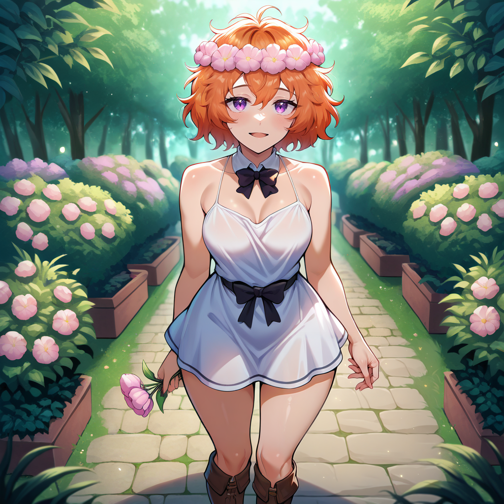 Outfit Prompts head wreath, pink flower, white dress, sleeveless, black bowtie, collared dress, detached collar, belt bow, black belt, brown boots, white skirt, short dress
