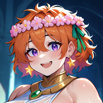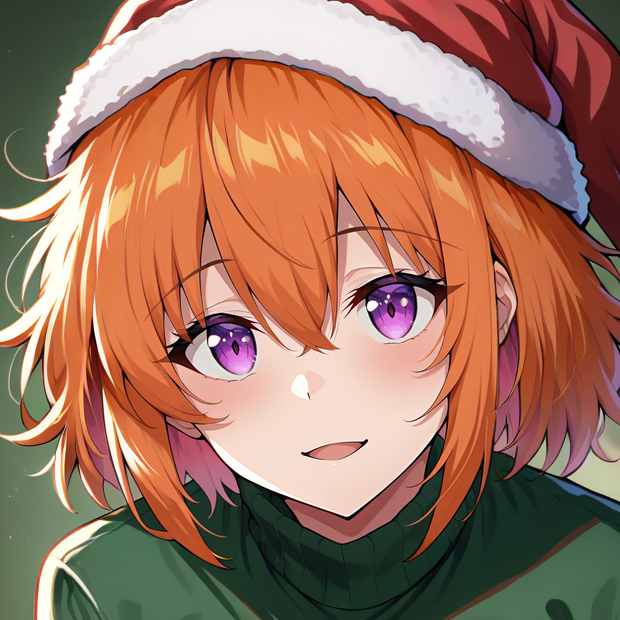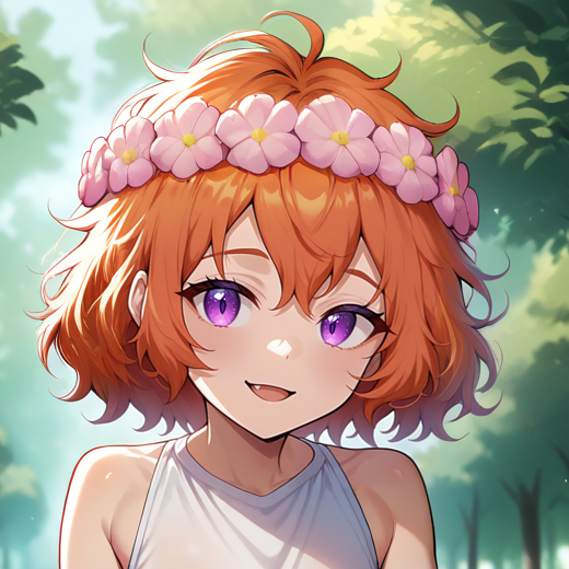 Physical Prompts 1girl, solo, orange hair, hair between eyes, short hair, messy hair, disheveled, purple eyes