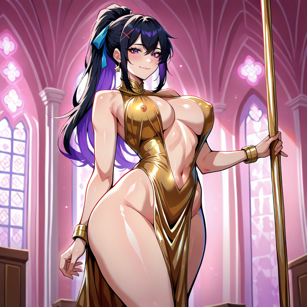 hair ornament, red x hair ornament, earrings, star earrings, blue ribbon, hair ribbon, red earring, purple earring, gold fur bracelet, gold fur collar, no panties, gold thighhighs, toeless legwear, sleeveless, bare legs, bare flank, partially naked, underboob, short pelvic curtain, gold pelvic curtain, center opening, gold dress, short dress, midriff, covered nipples
