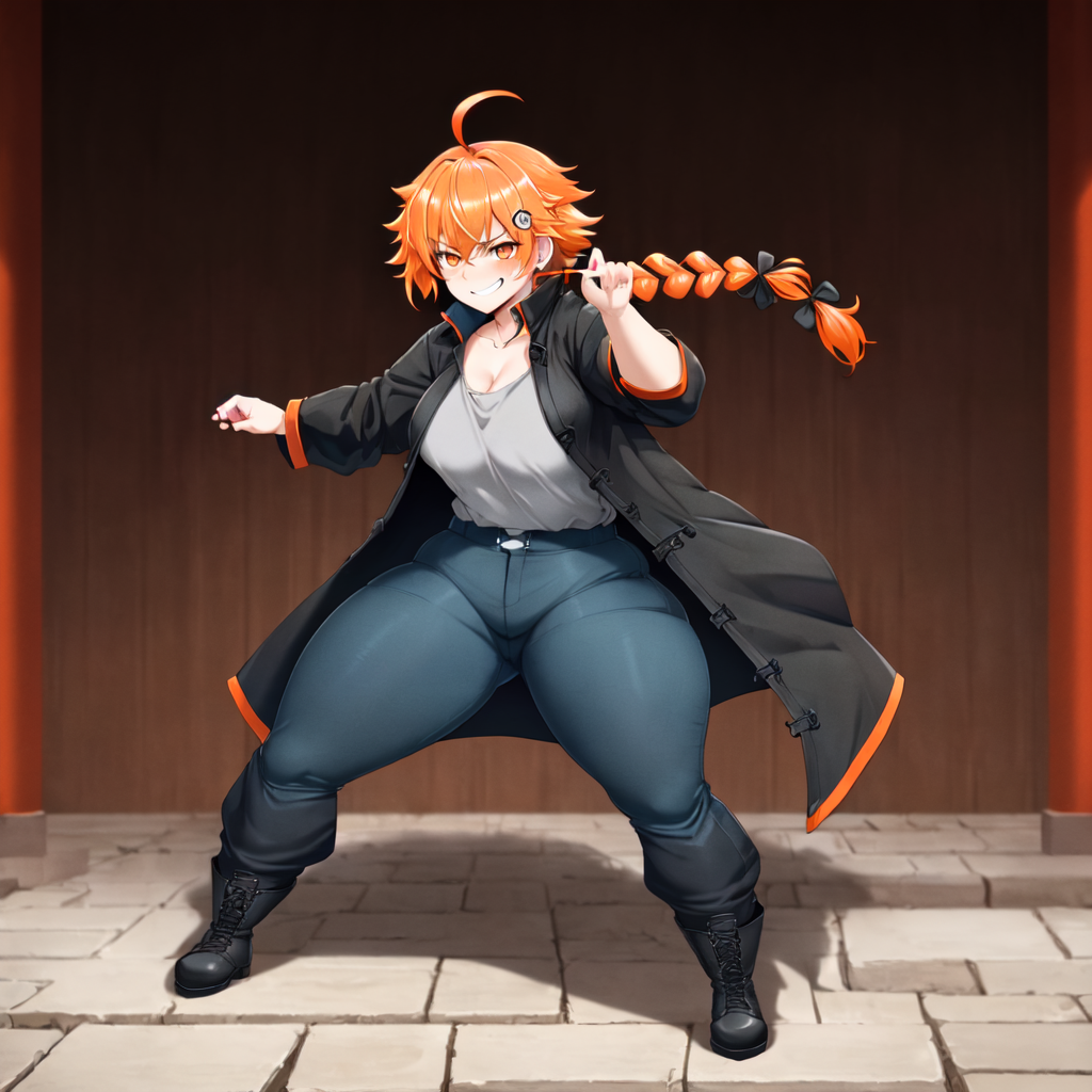 girl, solo, (fluo orange hair:1.3), hair between eyes, disheveled hair, ahoge, messy hair, single braid, (fluo orange eyes:1.3)