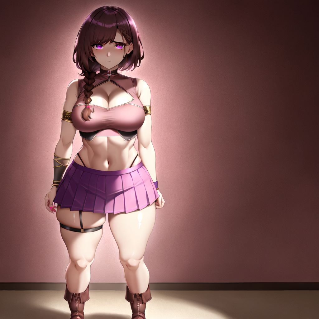 red shirt, navel, sleeveless, bandaged arm, cleavage, purple skirt, pleated skirt, knee skirt, purple garter belt, purple bracelet, purple armlet, purple anklet, brown boots