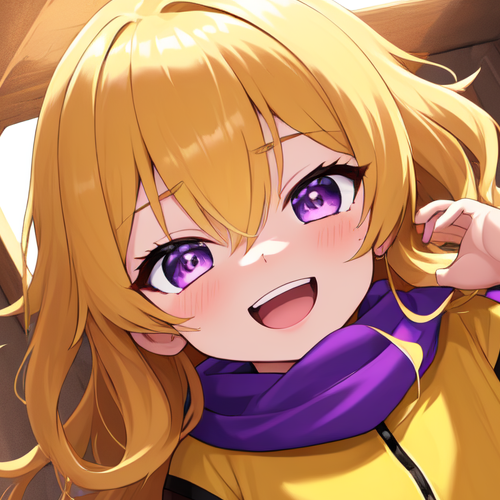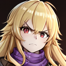 1girl, solo, yang xiao long, blonde hair, purple eyes, long hair, hair between eyes, bangs, frown