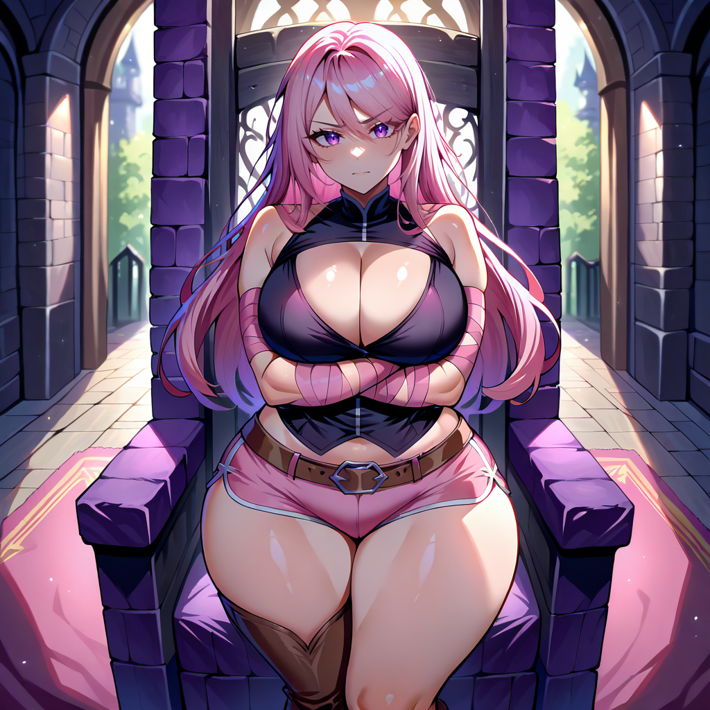 black crop top, sleeveless, pink bandages wrapped around arms, dark pink shorts, brown boots, pink garter, single garter, brown belt, cleavage