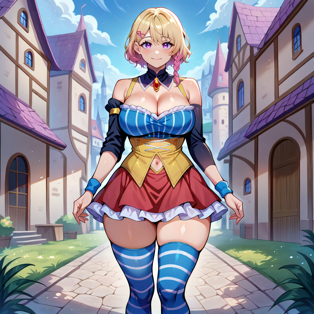 1girl, solo, blonde hair, short hair, single braid, front braid, pink highlights, front hair clip, light purple eyes