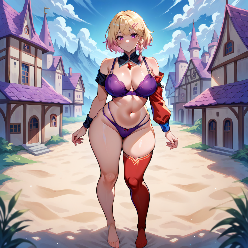 black choker, red gem, detached collar, red sleeves, detached sleeves, black armband, blue wristband, uneven sleeves, single sleeve, purple bra, purple panties, single thighhigh, red thighhighs, asymmetrical legwear, barefoot