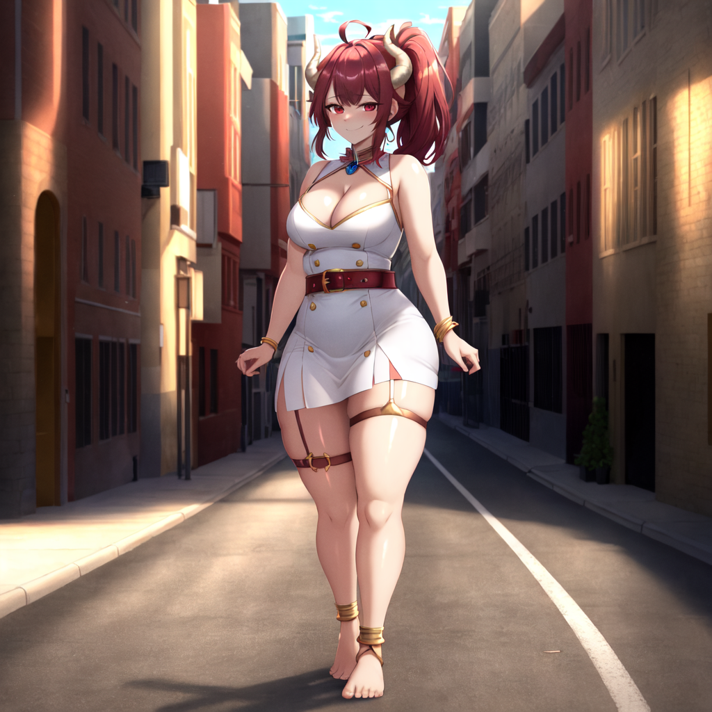 white dress, cleavage, sleeveless, gold bracelet, white belt, belt bow, short dress, puffy dress, barefoot, gold anklet, gold garter belt, single garter