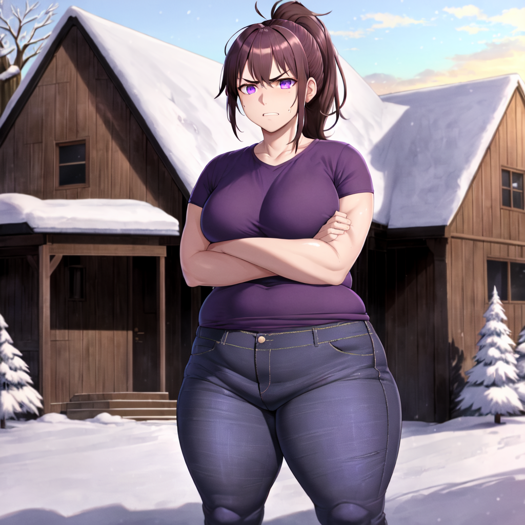 short sleeves, dark pale purple shirt, blue pants, jeans, black boots