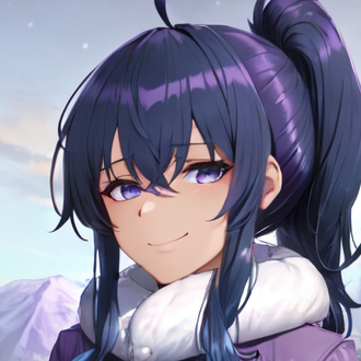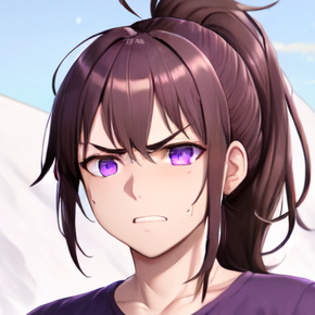 1girl, solo, brown hair, from brown to purple hair, gradient hair, hair between eyes, disheveled hair, medium hair, square cut, ponytail, high ponytail, messy hair, purple eyes, glowing eyes, rotting