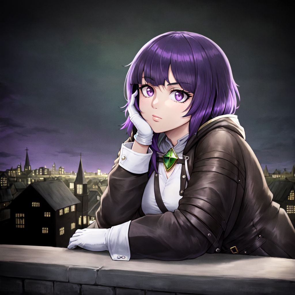 1girl, solo, dark purple hair, hair between eyes, parted bangs, bangs, messy hair, short hair, light purple eyes, slit pupils