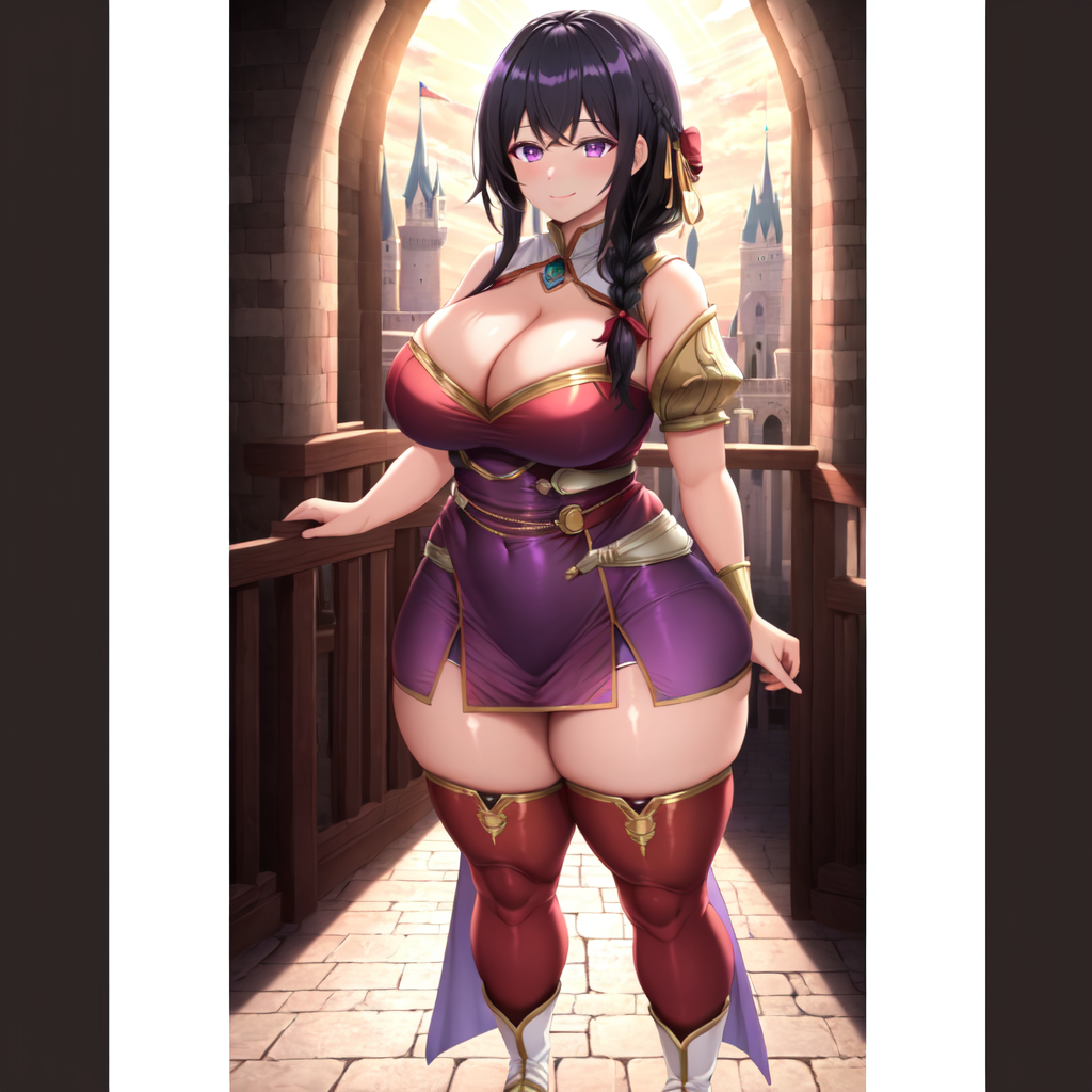 purple dress, short dress, gold gild, red thighhighs, white boots, cleavage, princess