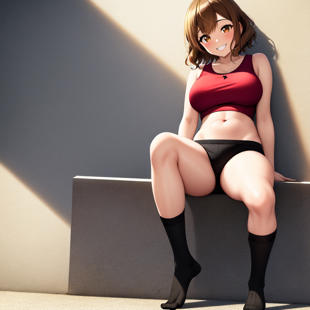 red tank top, navel, sleeveless, black shorts, black socks, gray socks, striped socks, striped socks, loose shorts, guitar, holding instrument, red guitar