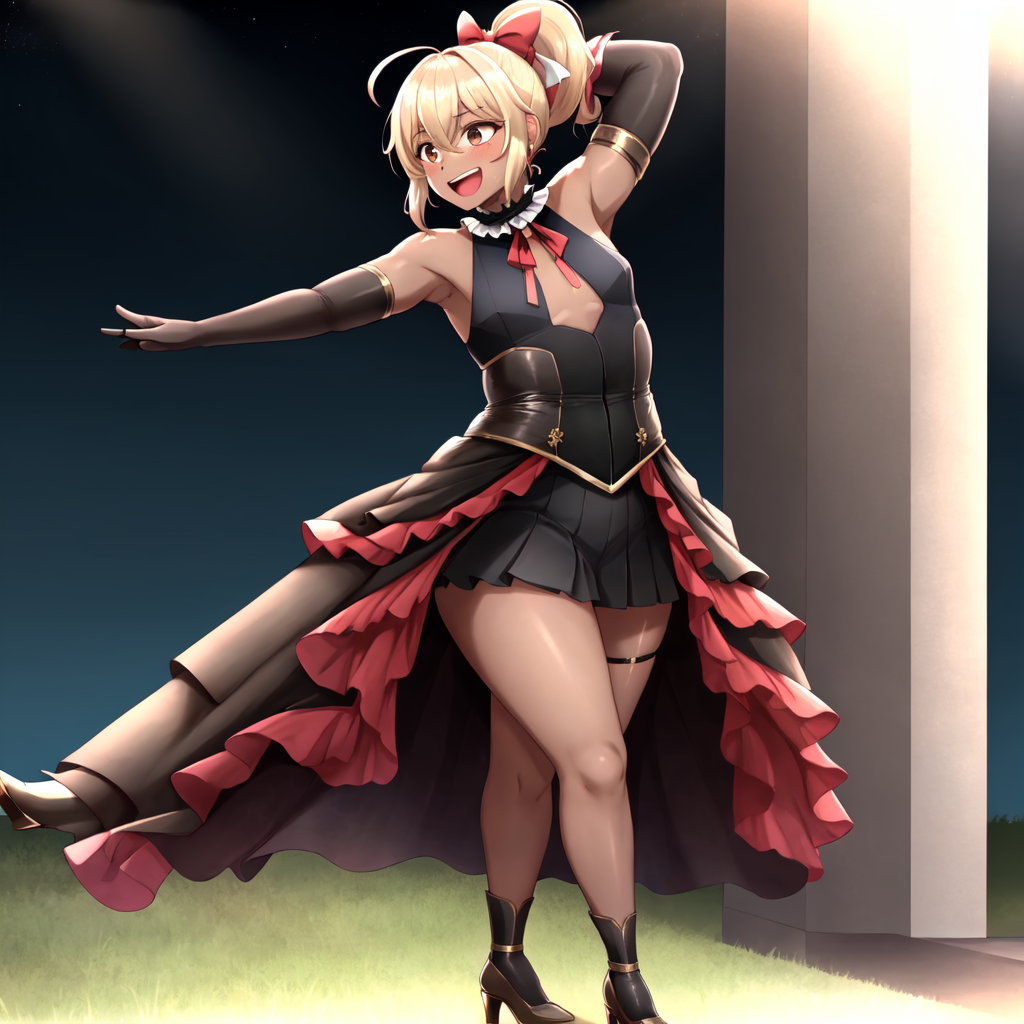 crossdressing, red bow, hair bow, black choker, frilled choker, pendant choker, blue gemstone, black gloves, elbow gloves, frilled gloves, gold armband, sleeveless, black dress, center opening, red ribbon, neck ribbon, white ribbon, black corset, gray skirt, layered dress, green skirt, short dress, puffy dress, brown high heels