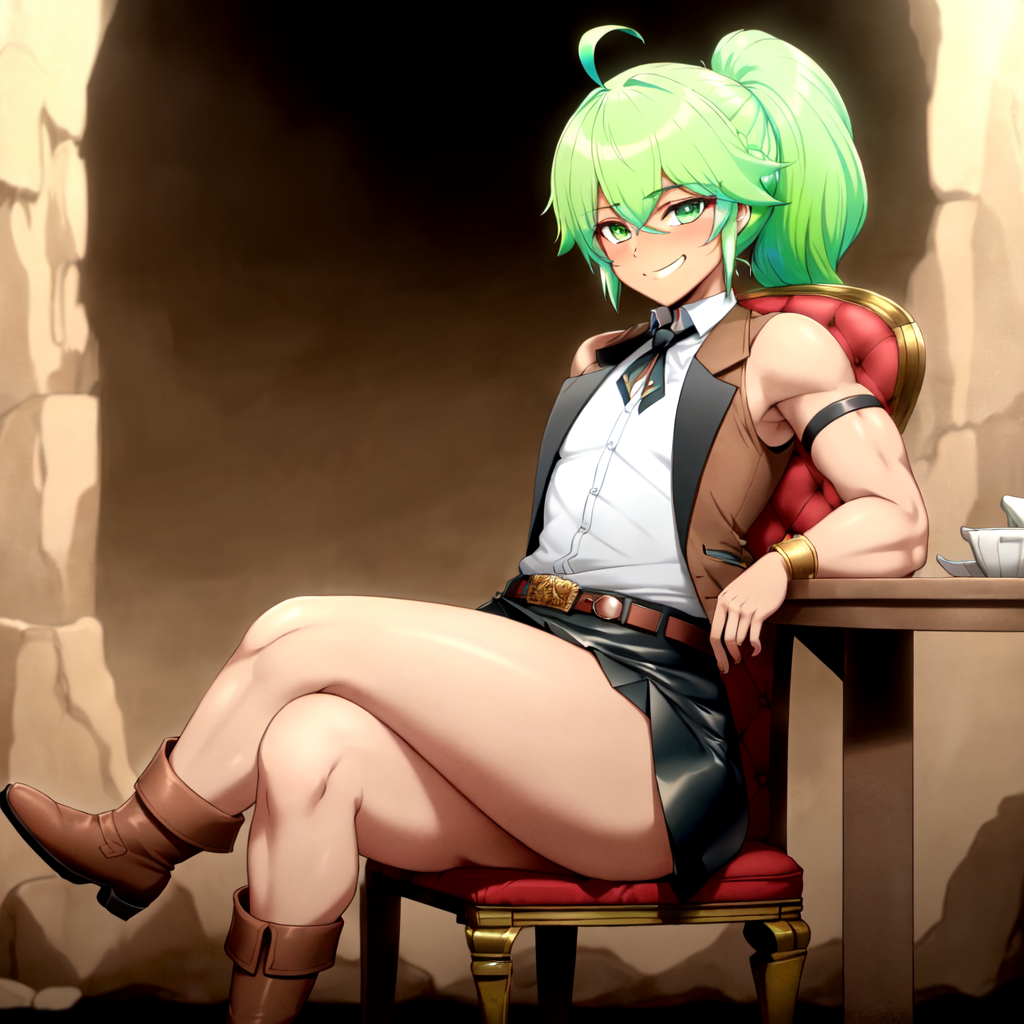 1girl, androgynous, (fluo green hair:1.3), ahoge, swept bangs, bangs, sidelocks, long hair, ponytail, long ponytail, tied hair, green eyes, tan
