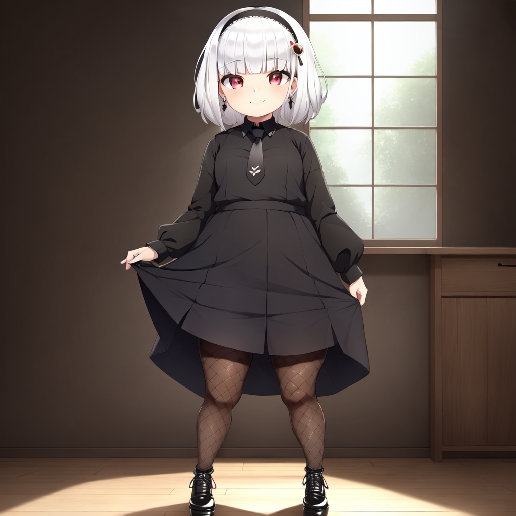 black dress, short dress, puffy dress, long sleeves, fishnet shirt, shirt under dress, black ribbon, necktie, neck ribbon, black pantyhose, black shoes, earrings, black feather earrings