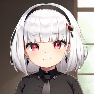 1girl, solo, white hair, blunt bangs, square cut, medium hair, black hairband, red eyes, big eyes