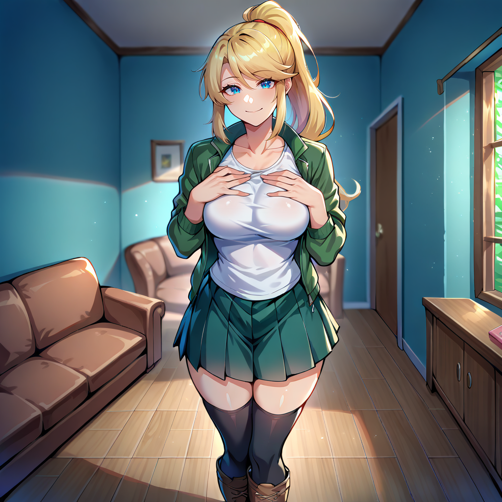 Outfit Prompts white tank top, green jacket, dark green skirt, pleated skirt, black thighhighs, brown boots, knee boots