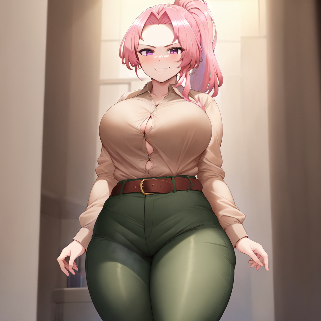 1girl, solo, (pink hair:1.3), ponytail, short ponytail, parted bangs, hair intakes, forehead, purple eyes