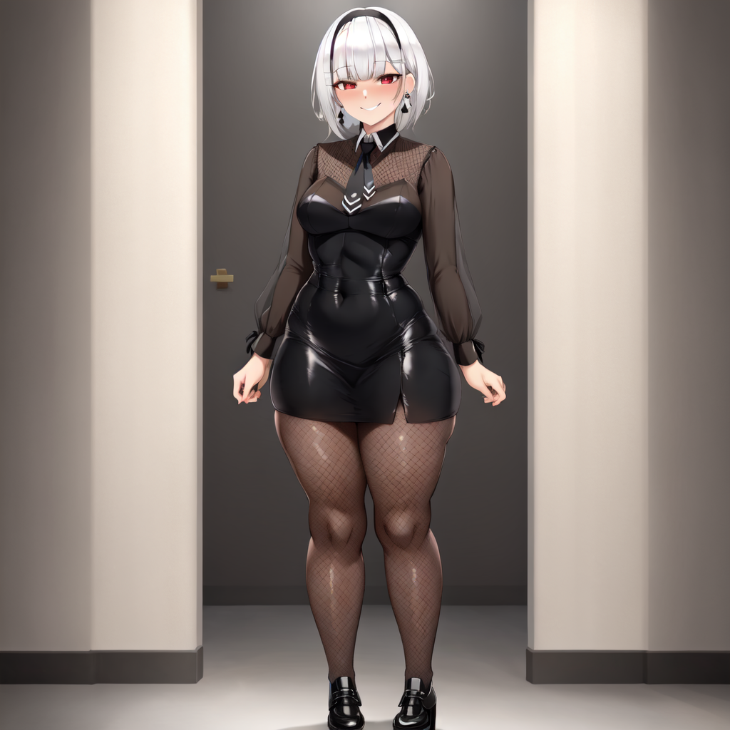 1girl, solo, white hair, blunt bangs, square cut, medium hair, black hairband, red eyes