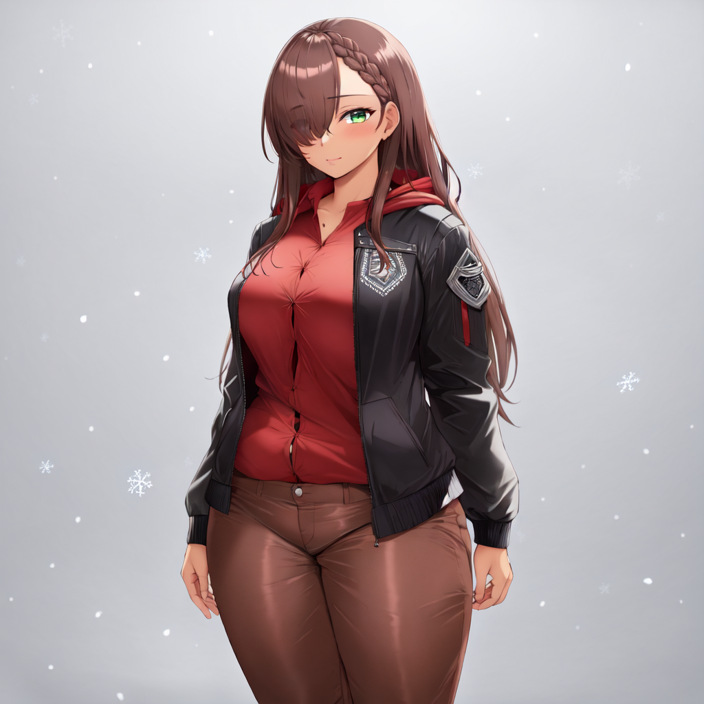 red shirt, snowflake print, (black jacket:1.2), open jacket, long sleeves, hood, hood down, brown pants, red shoes