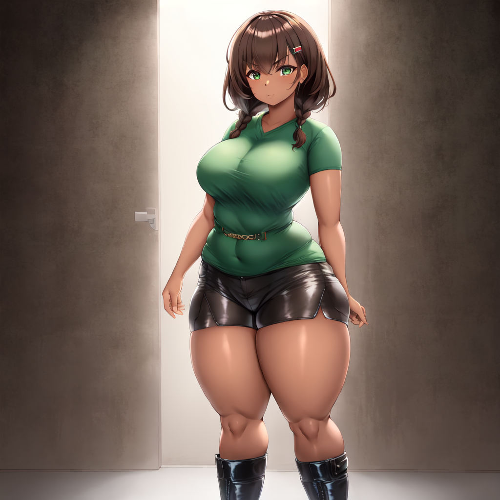 1girl, solo, dark brown hair, medium hair, sidelock, braided hair, twin braids, green eyes, dark skin, mixed