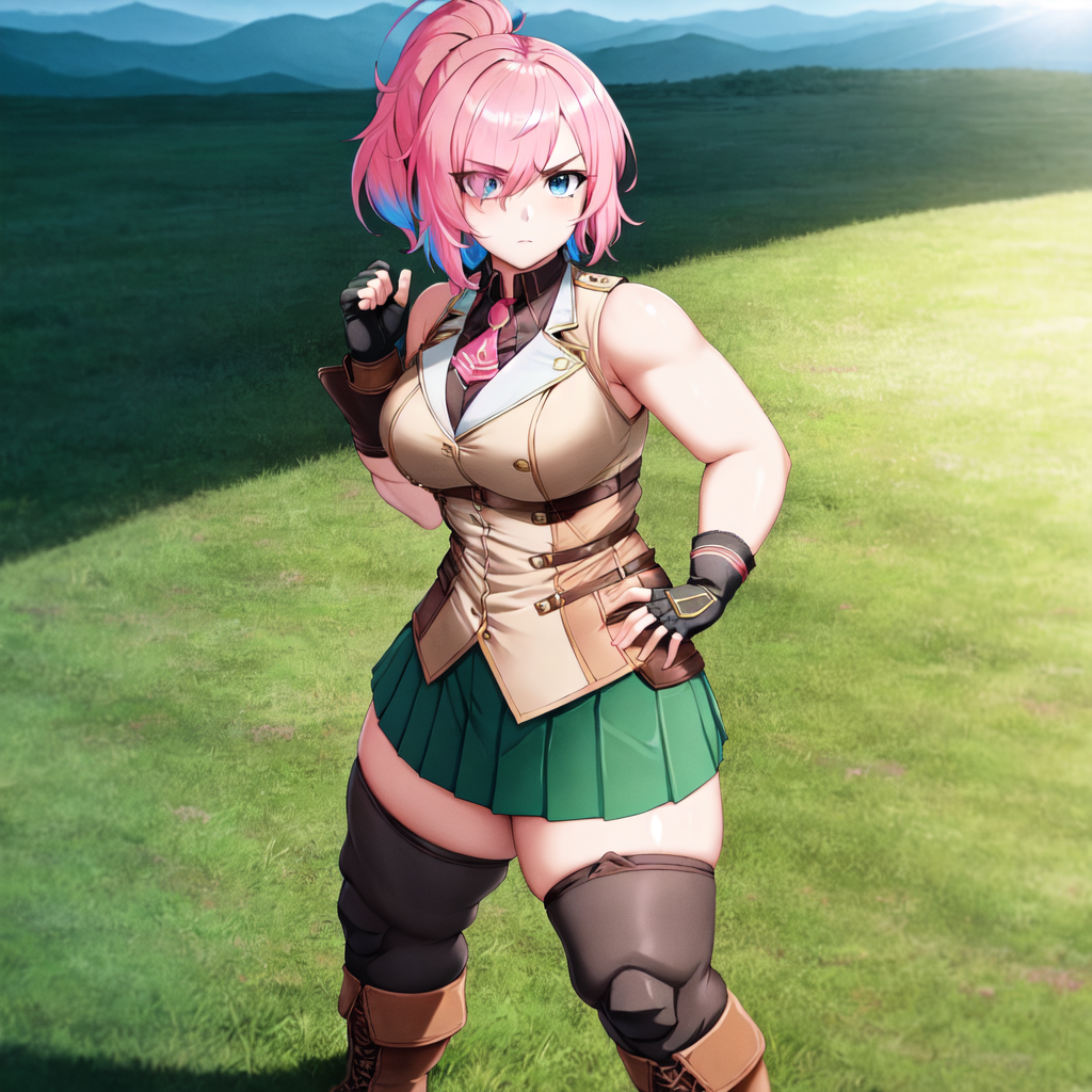 brown sweater, white vest, closed vest, sleeveless sweater, sleeveless vest, green shoulder armor, black gloves, fingerless gloves, green skirt, pleated skirt, zettai ryouiki, black thighhighs, brown boots, knee boots