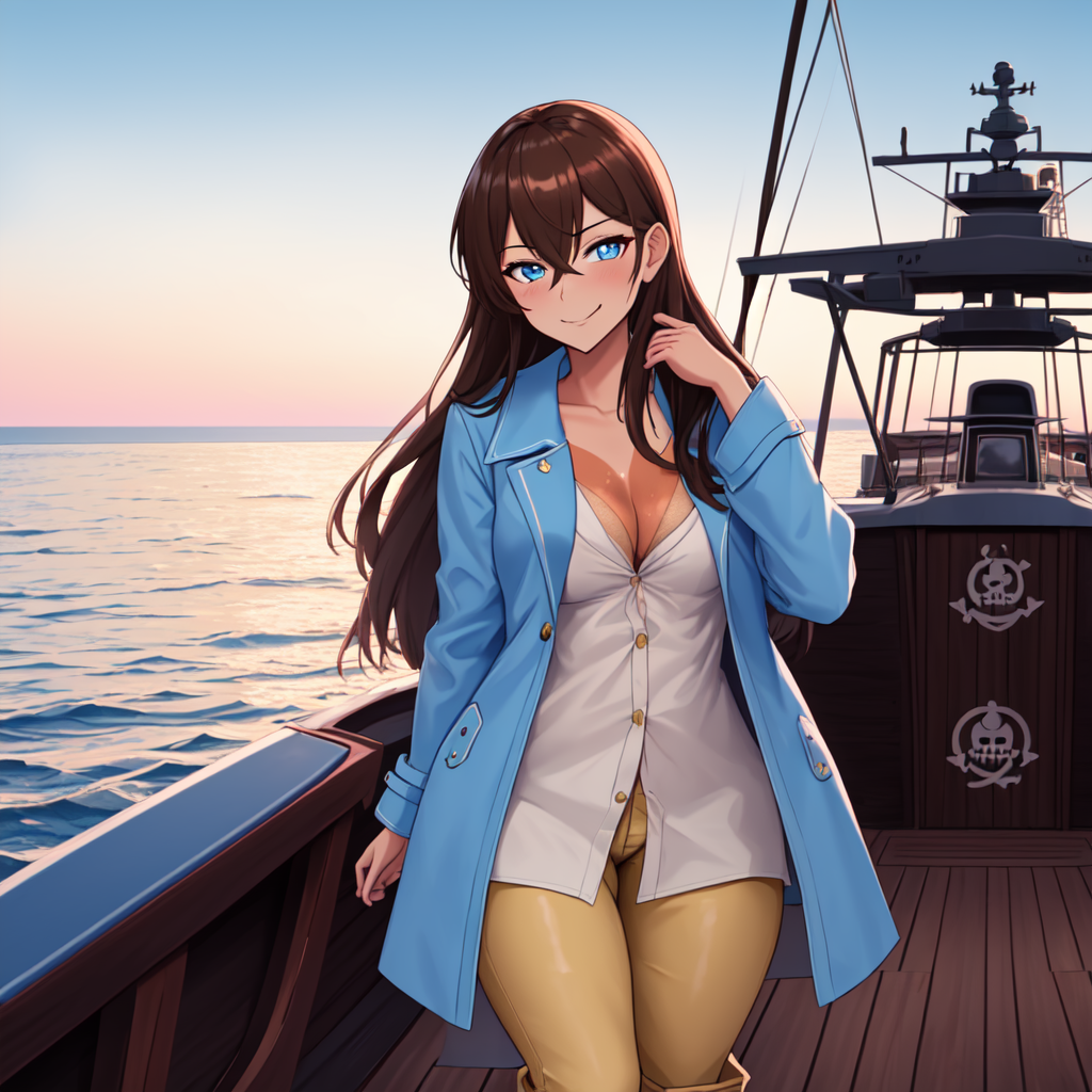 pirate, light blue coat, beige shirt, yellow boots, brown pants