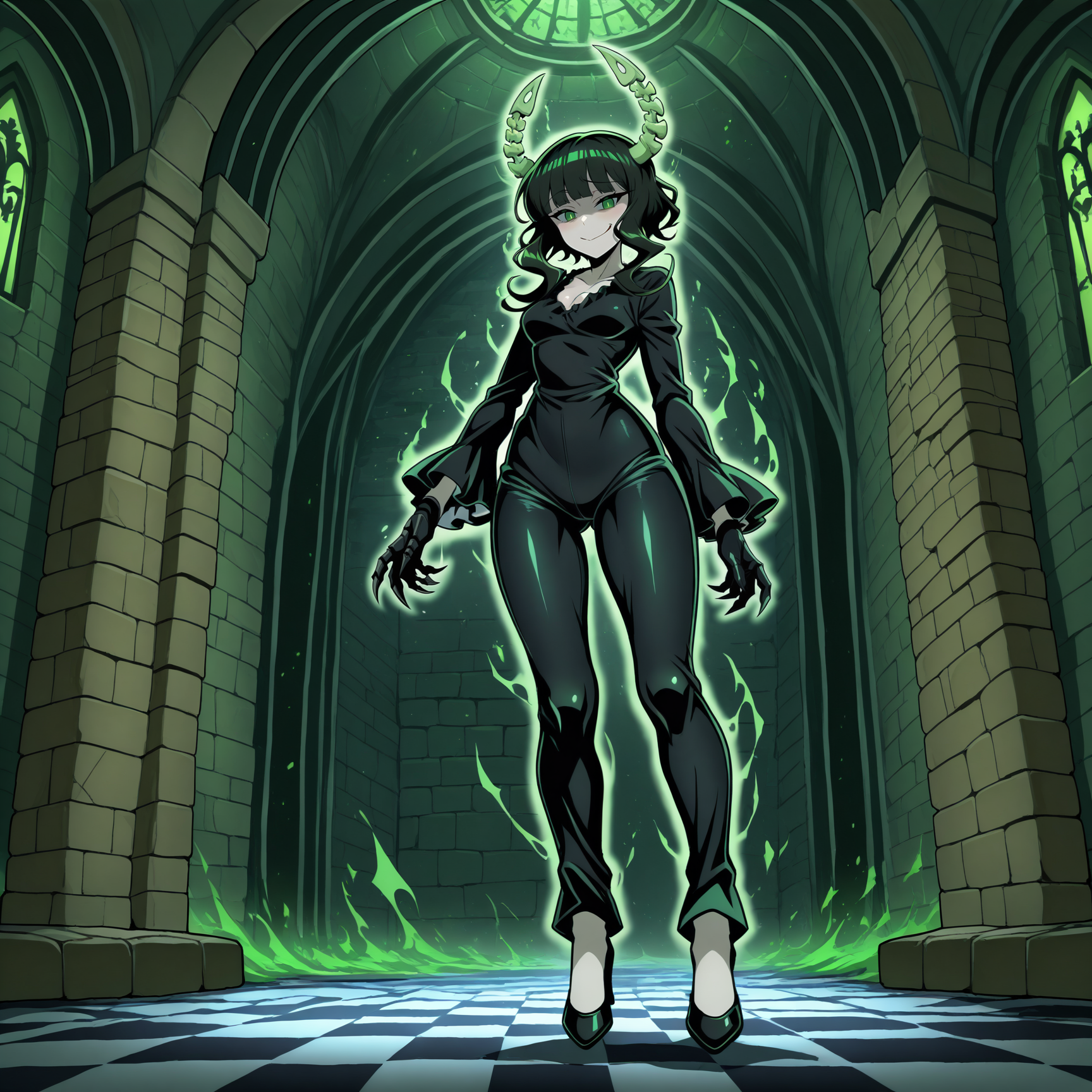 1girl, solo, dead master, black hair, blunt bangs, hair over breasts, long sidelocks, short hair, skeletal horns, green eyes, black hands, black claws