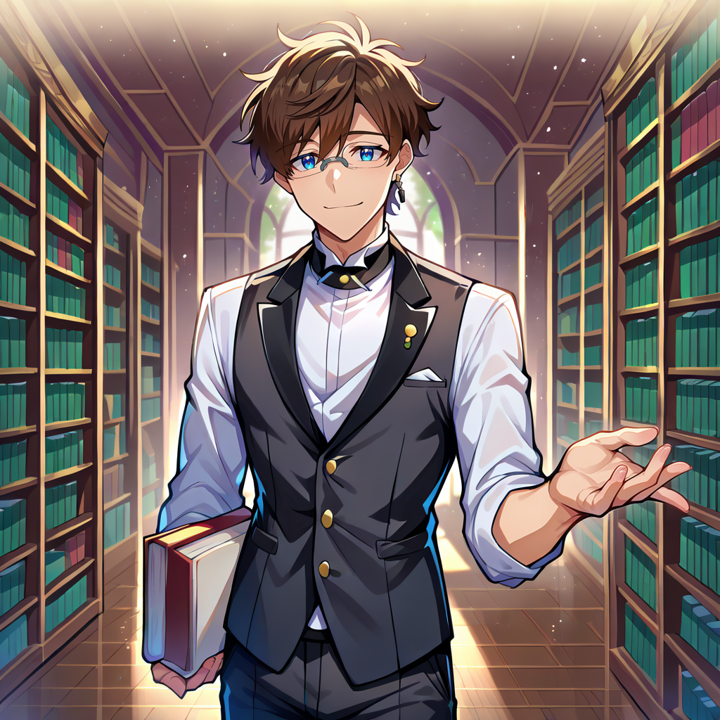 single earring, grey earring, glasses, grey-framed eyewear, white shirt, buttons, collared shirt, black collar, lace trim, black pants, tuxedo, black shoes