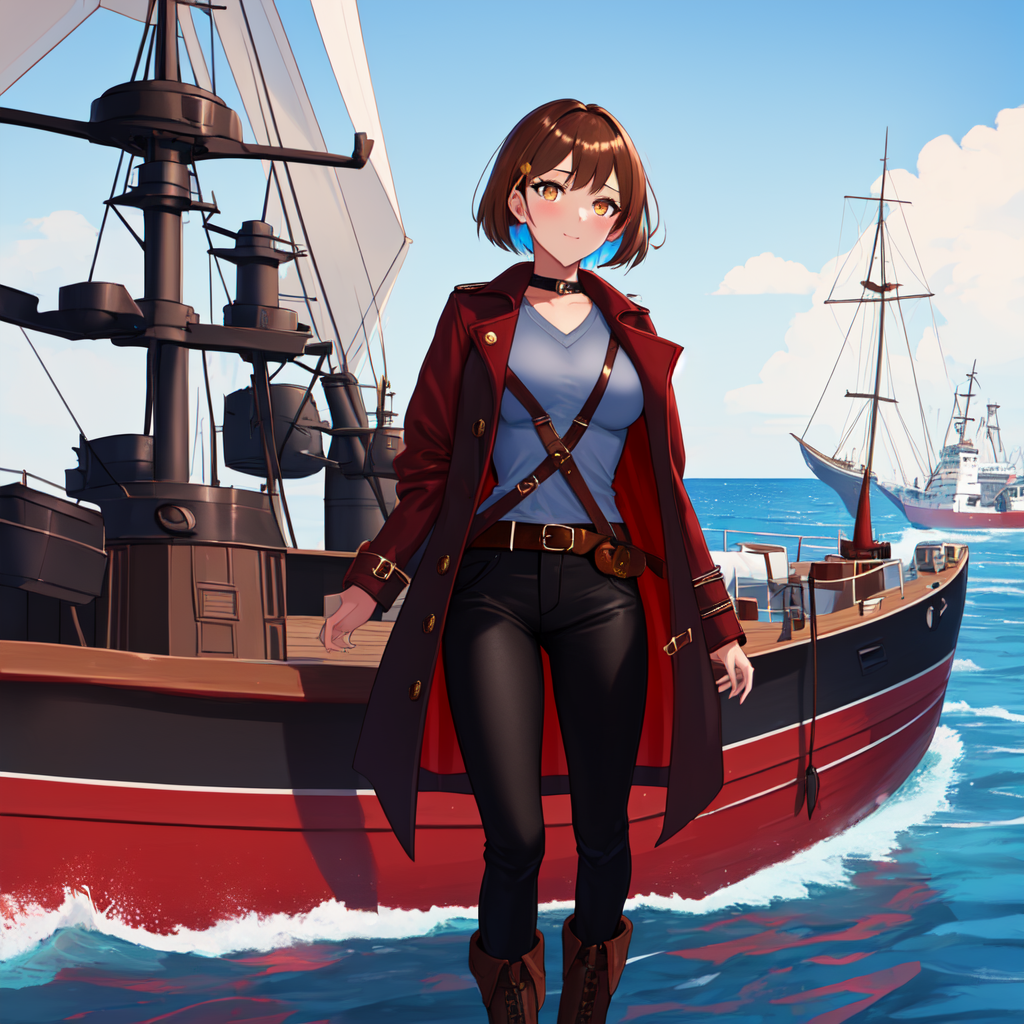 pirate, red long coat, blue ornments, gray shirt, brown belt, brown boots, black pants