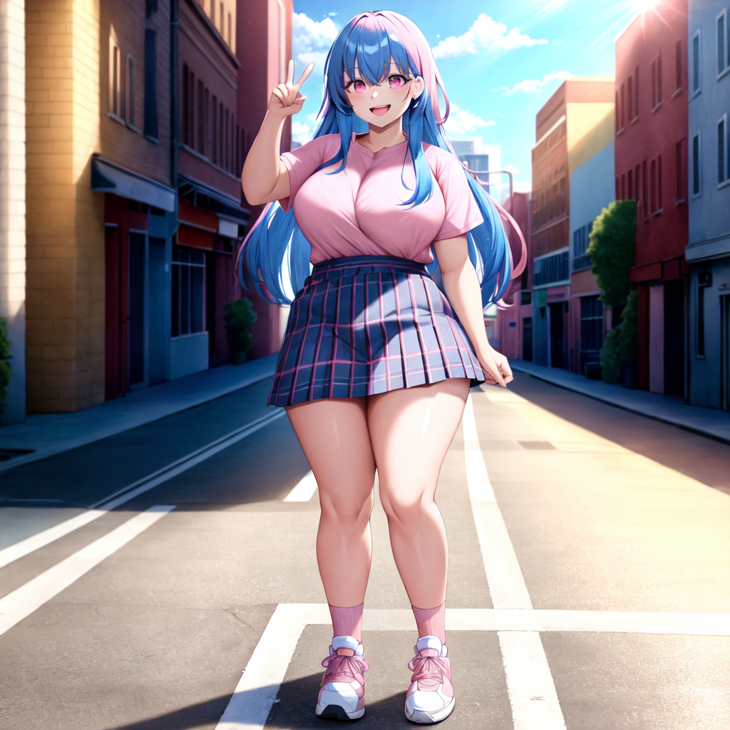 (light pink shirt:1.3), short sleeves, blue skirt, plaid skirt, miniskirt, white shoes, sneakers