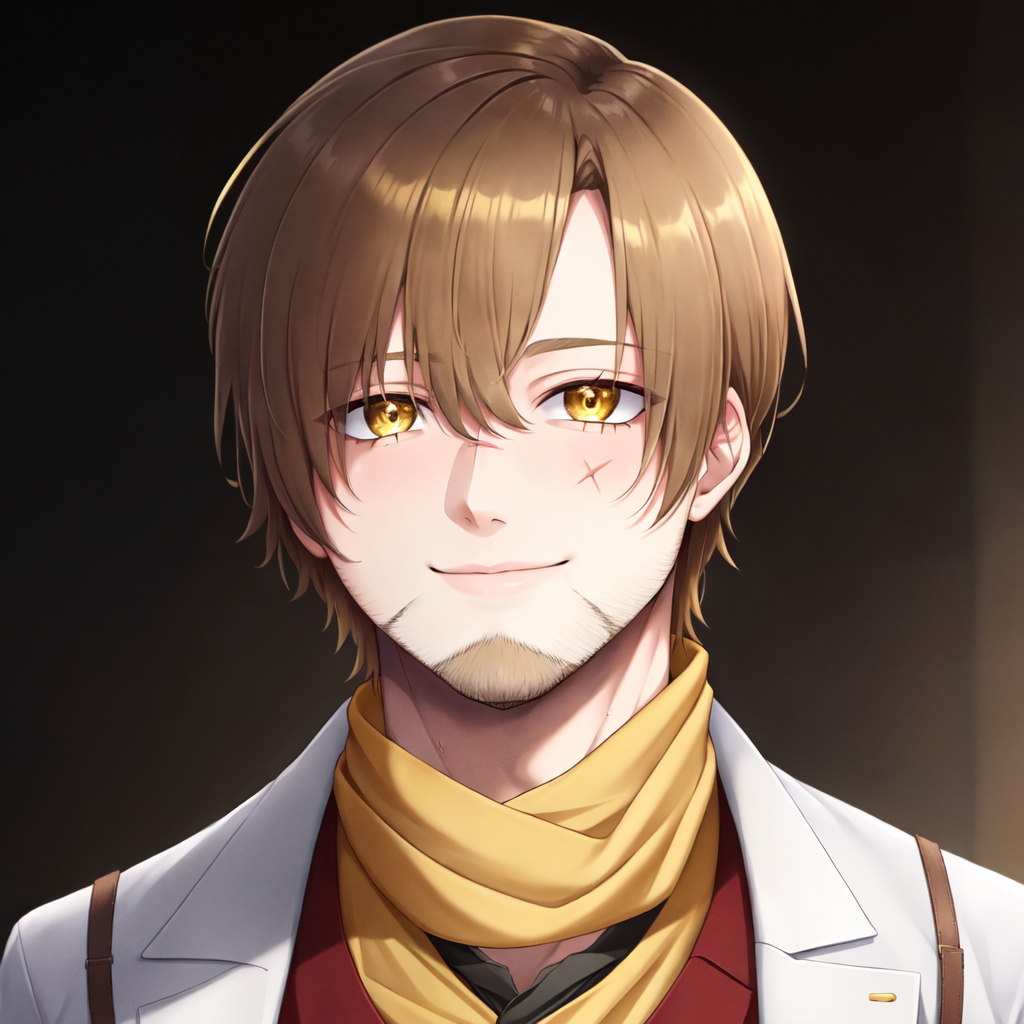 (1boy:1.3), solo, brown hair, short hair, disheveled hair, gold wrickles, gradient hair, (from brown to gold hair:1.2), gold eyes, scar on face, beard