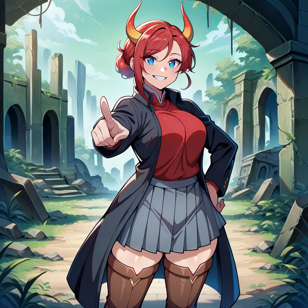 dark brown coat, red shirt, long sleeves, grey skirt, pleated skirt, zettai ryouiki, thigh boots, brown boots