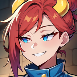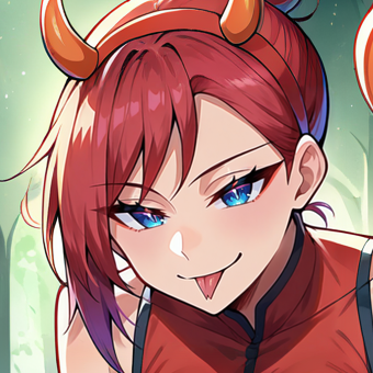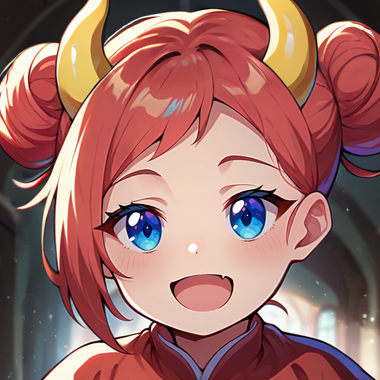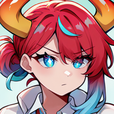 1girl, solo, red hair, very short hair, hair bun, single hair bun, single sidelock, blue eyes, horns, curled horns, dragon horns, gold and red horns stripped horns