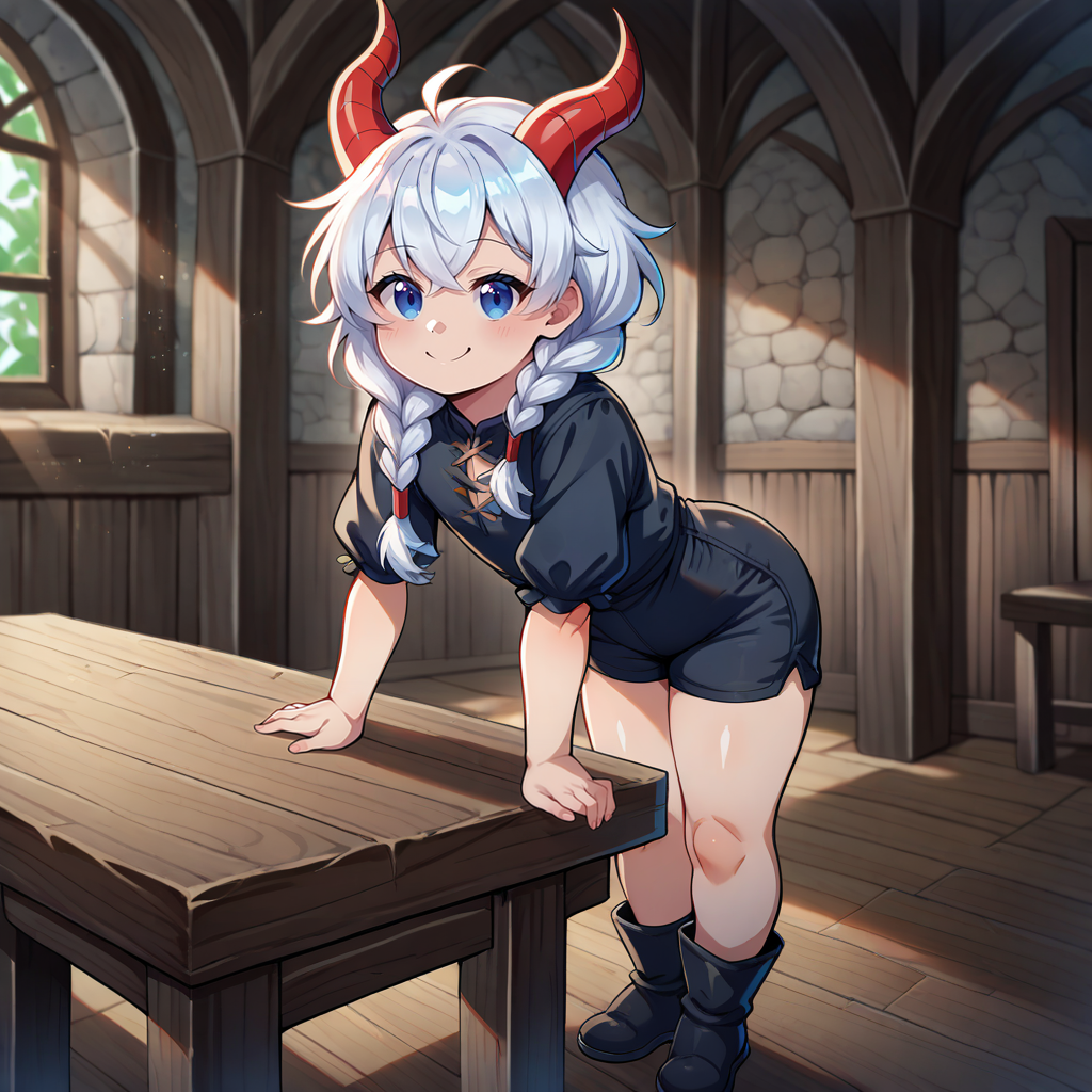 1girl, solo, white hair, square cut, braid, single braid, front braid, horns, dragon horns, striped horns, red horns, dark blue eyes