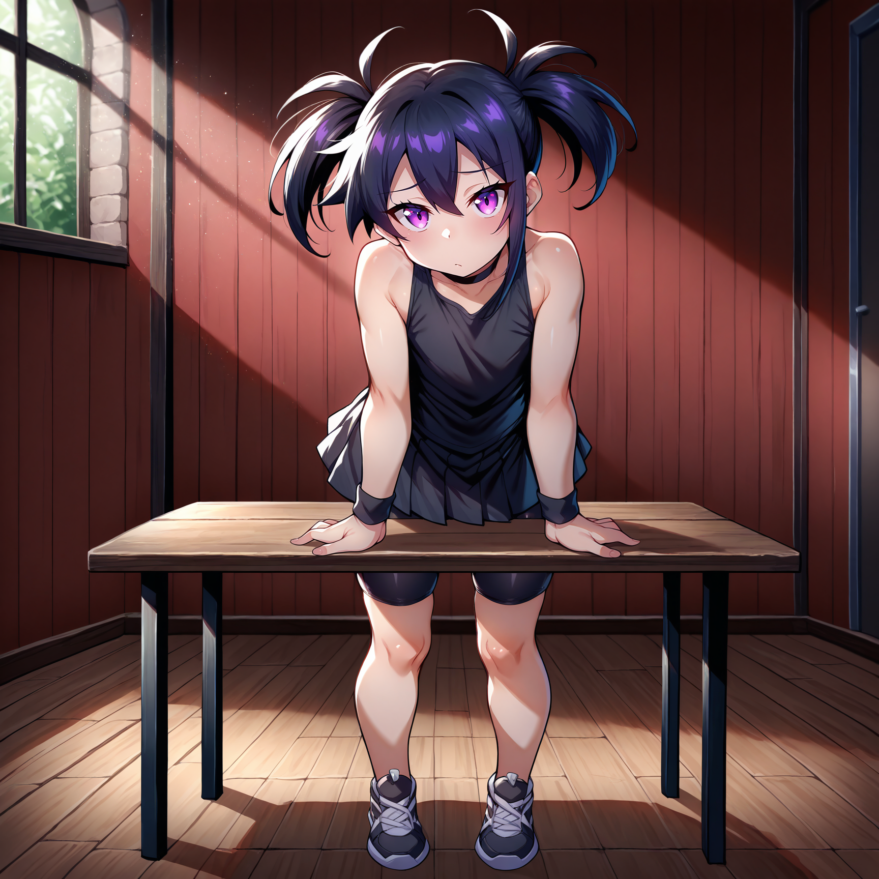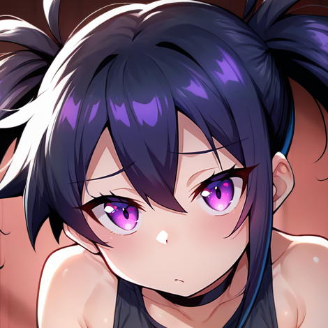 1girl, solo, black hair, twintails, short twintails, hair between eyes, single sidelock, purple eyes